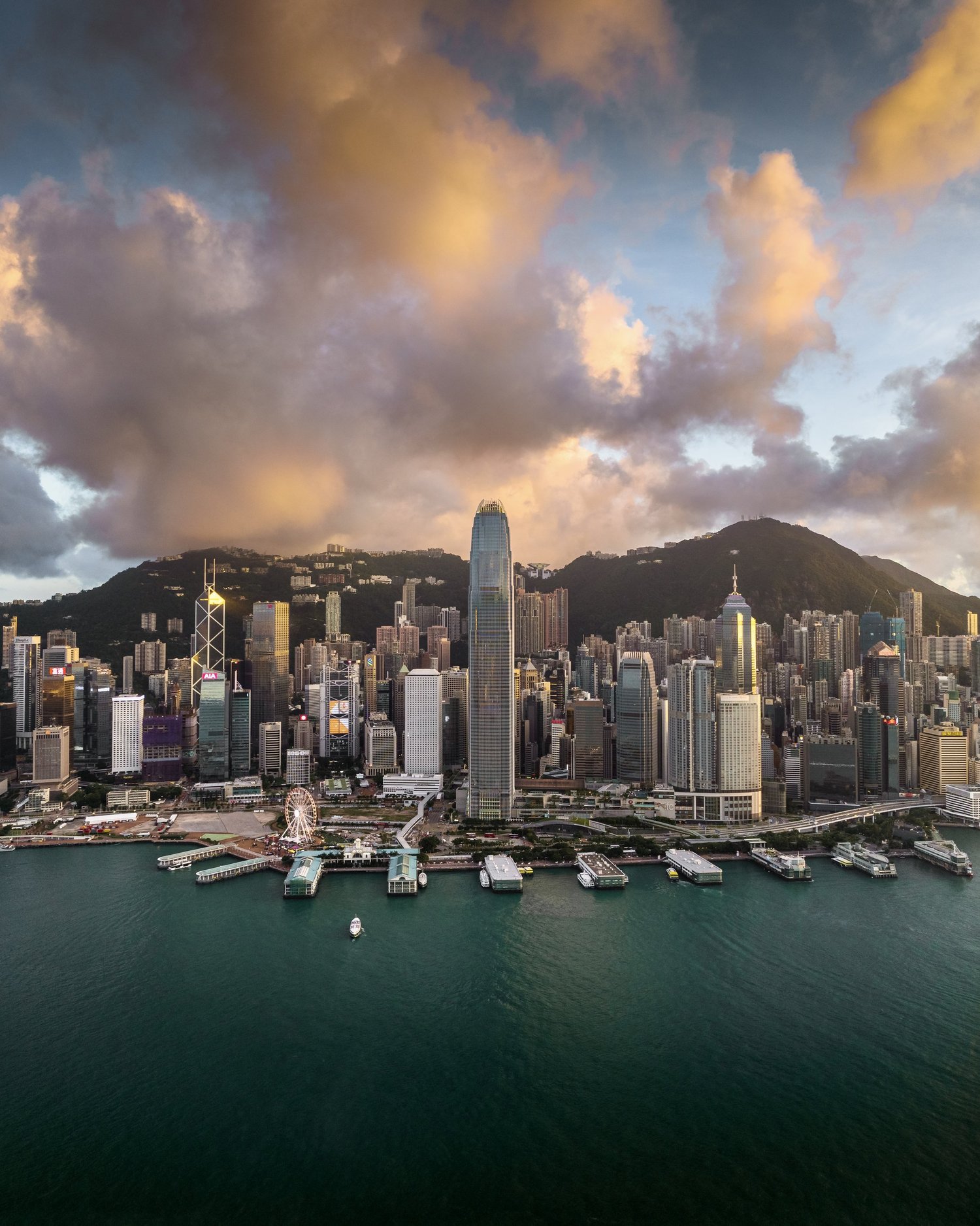 This image showcases the centre point of one of the most famous skylines in the world, the Central Harbour and IFC building. Taken on a beautiful day before sunset, the pink clouds serve as the perfect backdrop to the resplendent pillars of concrete and glass.